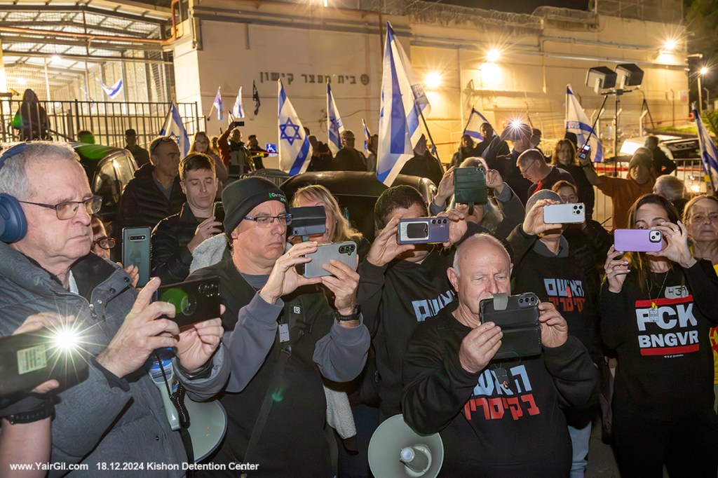 במקביל – פעולה דומה אצל כולם והמבט לאותו הכיוון. ערב יום העצמאות בכיכר קריית ספר, חיפה, גשם בוץ מטפטף, ודומה שהאובך מתפזר 30.4.2025. משמרת המחאה להחזרת החטופים מעזה, מציינת את החג עם שלטים ובהם דיוקנאות החטופים.
