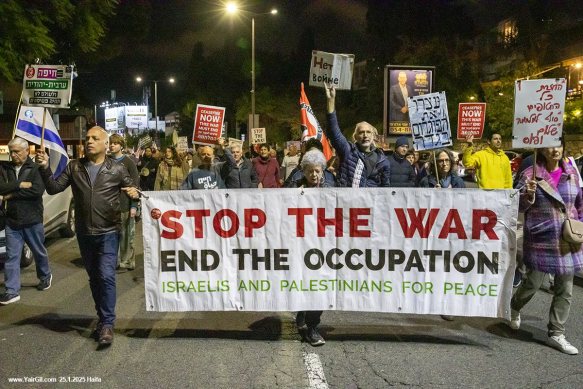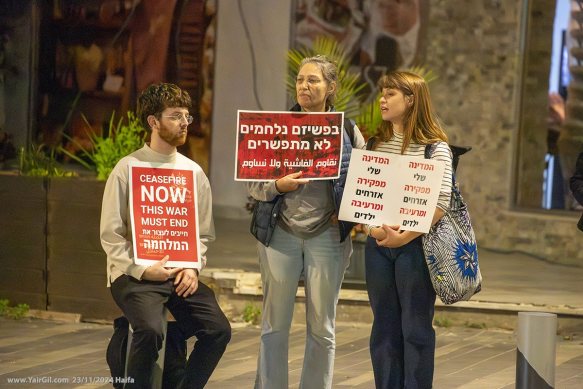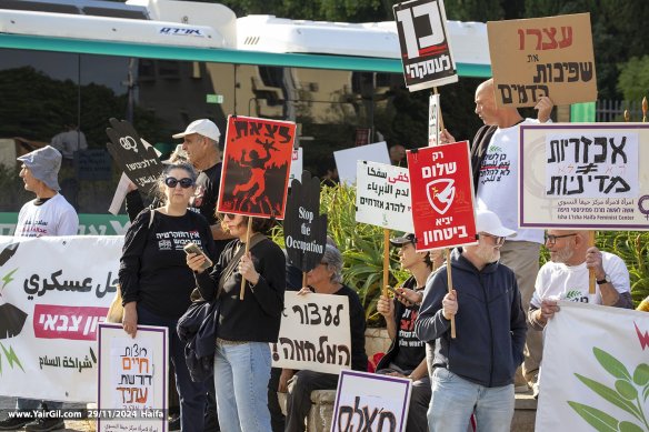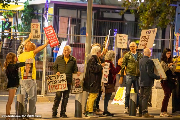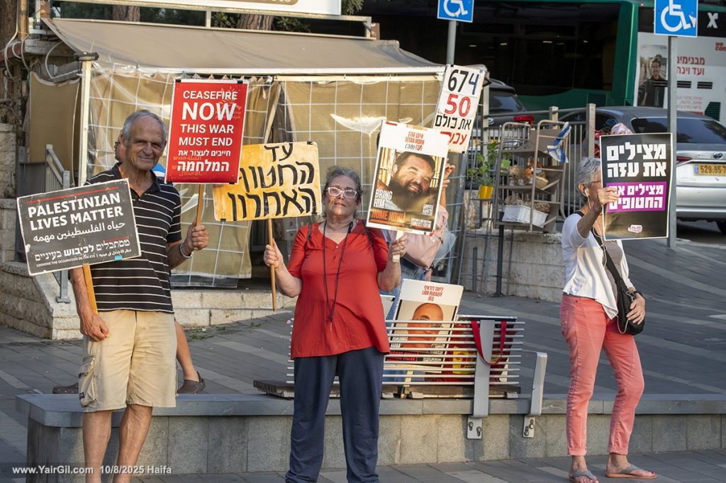 הסכמים מצילים חייםתמונות של ילדים עזתים שנהרגו במלחמה בהפגנה השבועית בצומת מרכז חורב בחיפה, 26.4.2025,.שתי הפגנות נגד המלחמה התקיימו הערב 18.3.2025 בחיפה. ההפגנות קראו להפסקת אש, בגרסאות שונות. היו שני עצורים בהפגנה אחת, ואחת בהפגנה השניה – – התמונה מתוך עמוד בwww.yairgil.comהפגנה בחיפה 25.1.2025 נגד התנהלות נתניהו וממשלתו ובתקווה להחזרת החטופים מעזה במהרה . צורת מרכז חורב, על הכרמליהודים וערבים במשמרת מחאה עם קול ברור נגד המלחמה, נגד הפקרת החטופים, ובעד מאבק למען שלום וצדק לשני העמים. כיכר אונסק"ו לשלום וסובלנות, חיפה 29.11.2024יהודים וערבים במשמרת מחאה עם קול ברור נגד המלחמה, נגד הפקרת החטופים, ובעד מאבק למען שלום וצדק לשני העמים. כיכר אונסק"ו לשלום וסובלנות, חיפה 29.11.2024Carmel Center, Haifa 23/11/2024 "Stop the war / End the Occupation" + "Ceasefire NOW / This war must end" [Israelis and Palestinians for peace]