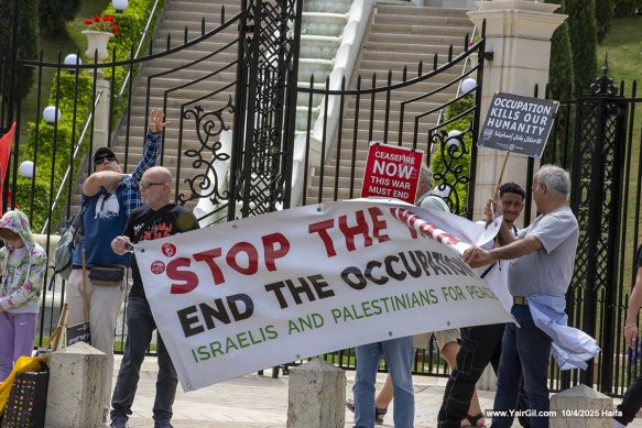 זו הפגנה יומית בין 18:00 ל 19:00משמרת חיפאית למען החזרת החטופים ממחילות רצועת עזה לאלתר וסיום מיידי של המלחמה. מרכז הכרמל 10-8-2025יהודים וערבים במשמרת מחאה מתחת לגן הבהאי, בכיכר אונסק"ו לשלום ולסובלנות בחיפה. הסיסמא העיקרית היא Stop התמונה מתוך the War' וגם End the Occupation/ + No more deaths + +סגל חיפה אומר די למלחמה Haifa faculty say STOP THE WAR 19-5-2025 University of Haifa