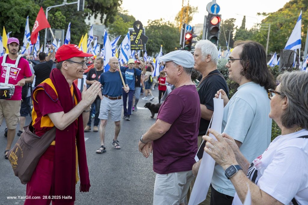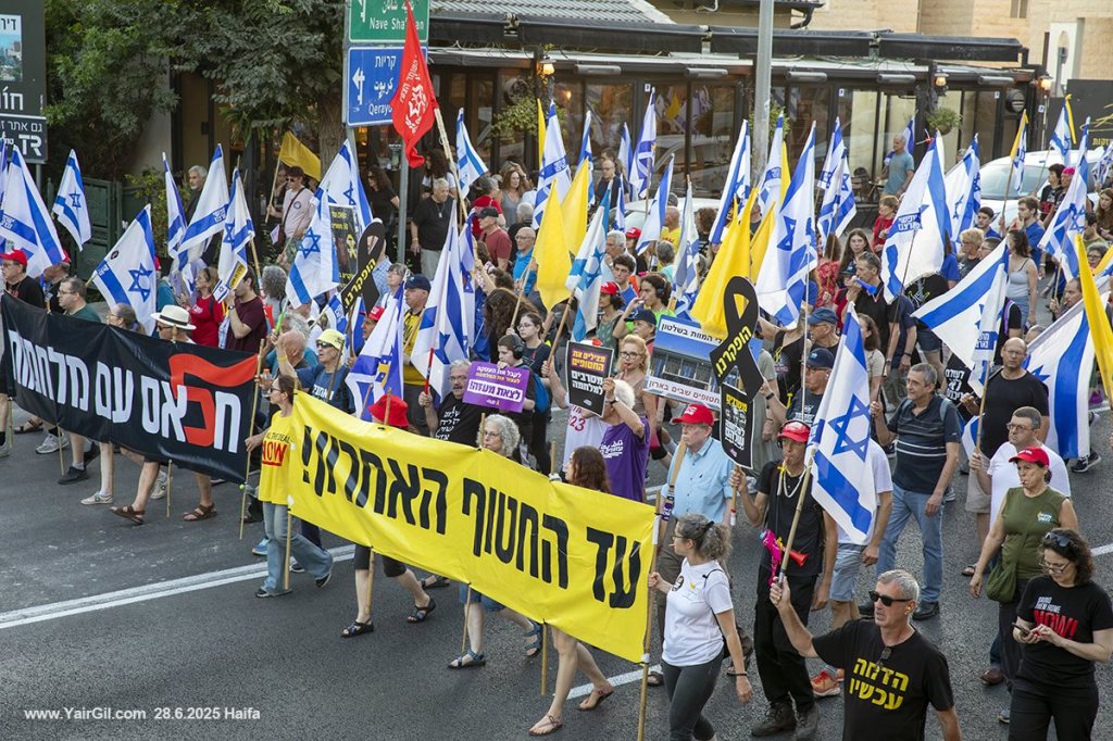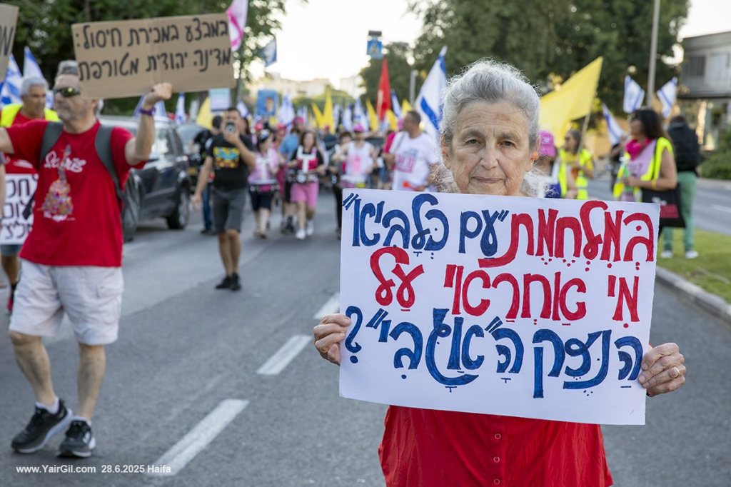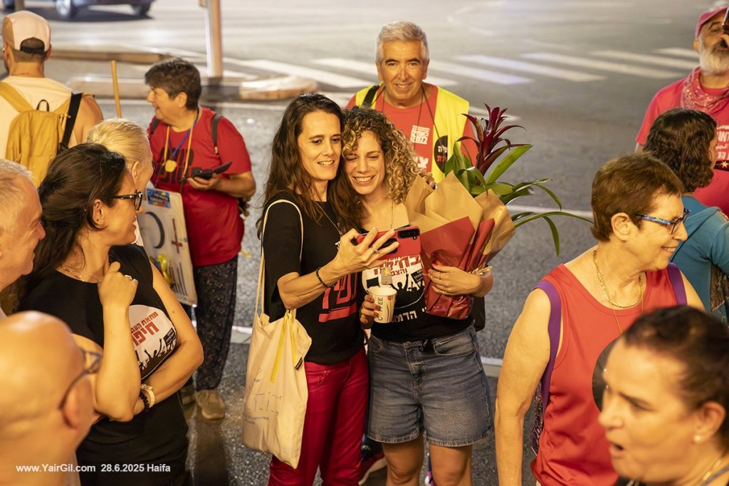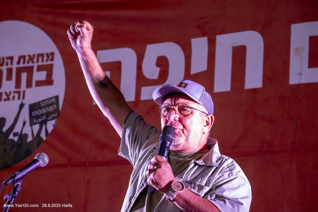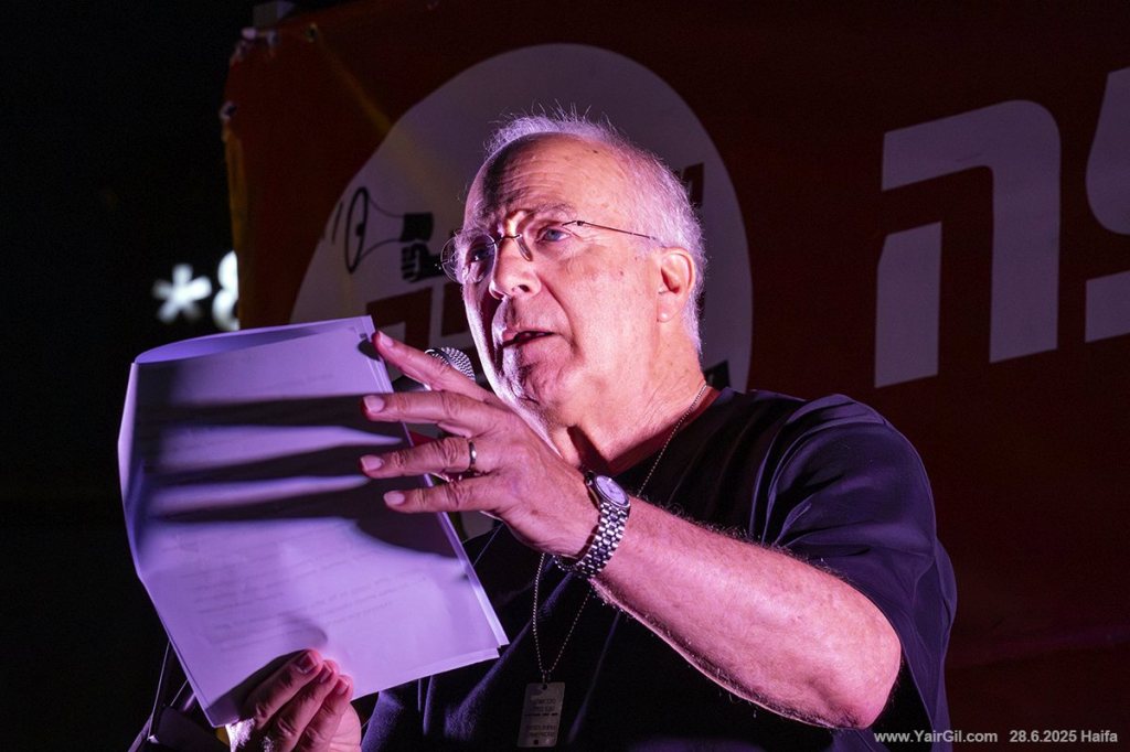 השבוע ה-91 למלחמת השיבעה באוקטובר החל. ההפגנה הראשונה אחרי המלחמה עם אירן סימנה השתתפות מוגברת של קהל מפגינים – 28.6.2025 – דני אלגרט, סנ"צ בדימוס, מורה ומחנך, שאחיו איציק אלגרט נרצח בשבי בעזה ביקש מהקהל להניף אגרוףהשבוע ה-91 למלחמת השיבעה באוקטובר החל. ההפגנה הראשונה אחרי המלחמה עם אירן סימנה השתתפות מוגברת של קהל מפגינים – 28.6.2025 – פרופ' דוד הראל – ממכון ויצמן, חתן פרס ישראל ונשיא האקדמיה הלאומית הישראלית למדעים, על בימת מחאת העם חיפההשבוע ה-91 למלחמת השיבעה באוקטובר החל. ההפגנה הראשונה אחרי המלחמה עם אירן סימנה השתתפות מוגברת של קהל מפגינים – 28.6.2025 "מלחמת שלום הקואליציה" אומר השלטהשבוע ה-91 למלחמת השיבעה באוקטובר החל. ההפגנה הראשונה אחרי המלחמה עם אירן סימנה השתתפות מוגברת של קהל מפגינים – 28.6.2025 – לצד הבמה, ראיין העתונאי סמיר עבדאלהאדי את עו"ד גונן בן יצחק