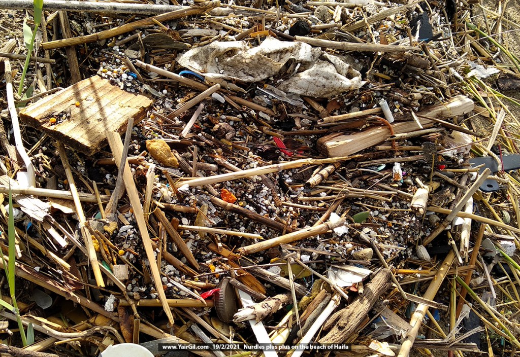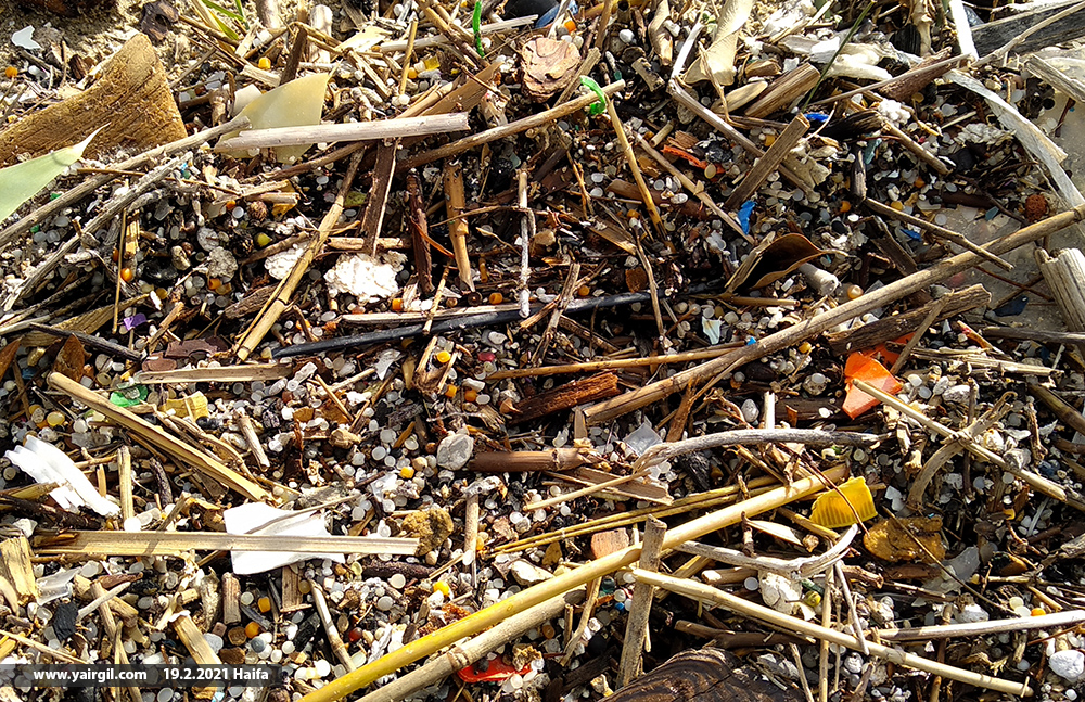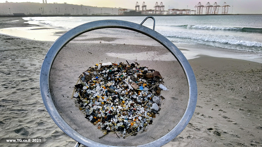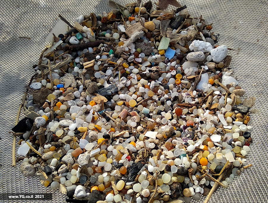 נורדלים מחוף הים של חיפה ועצמים אחרים במסננת. 2021. פלסטיקים אחרים: מוצר שיהפוך למוצרים אם לא יאבדו אותו לסביבה.