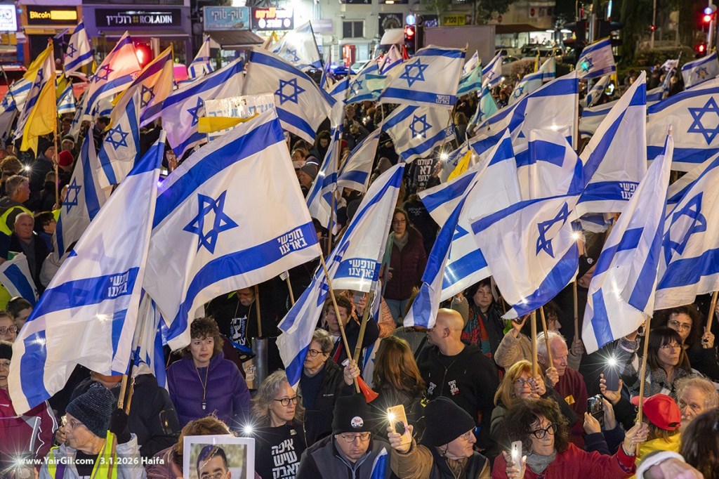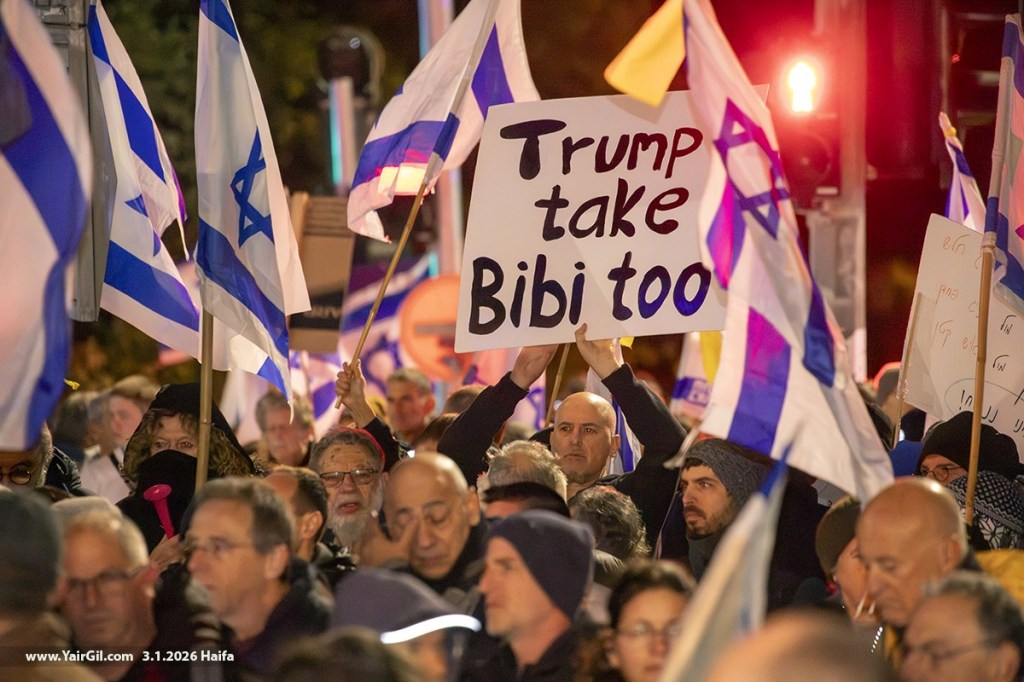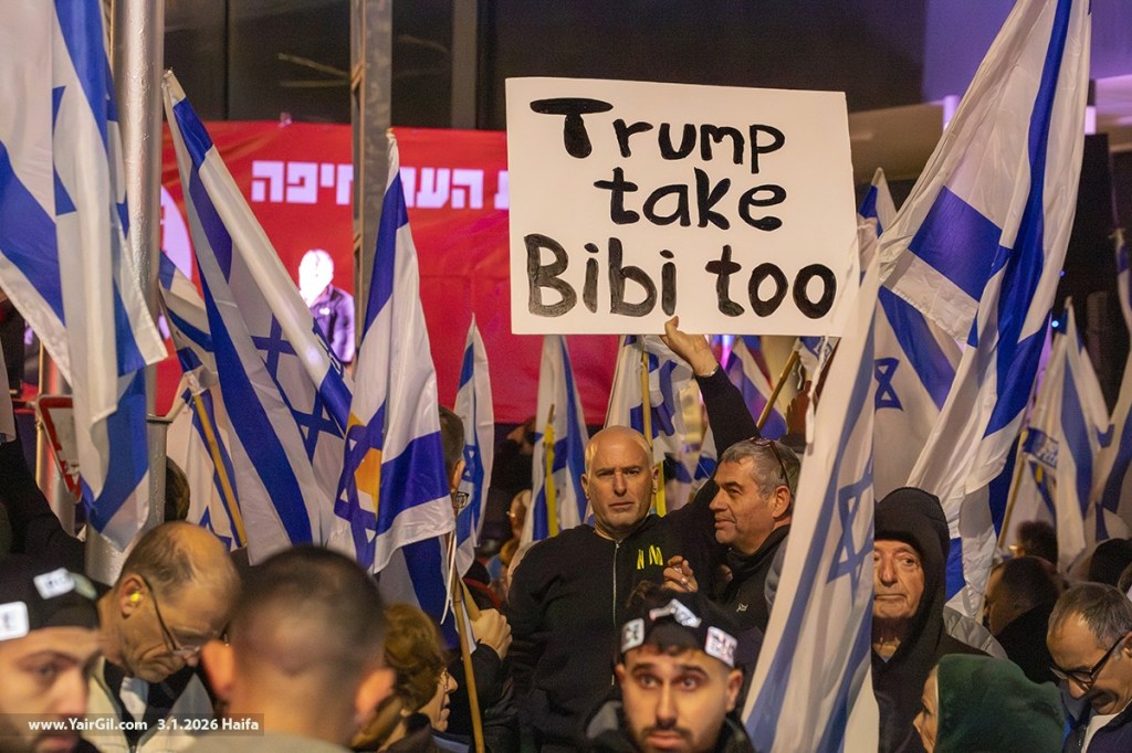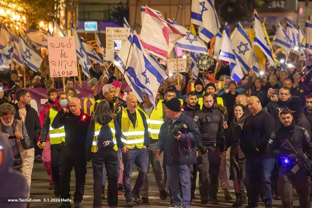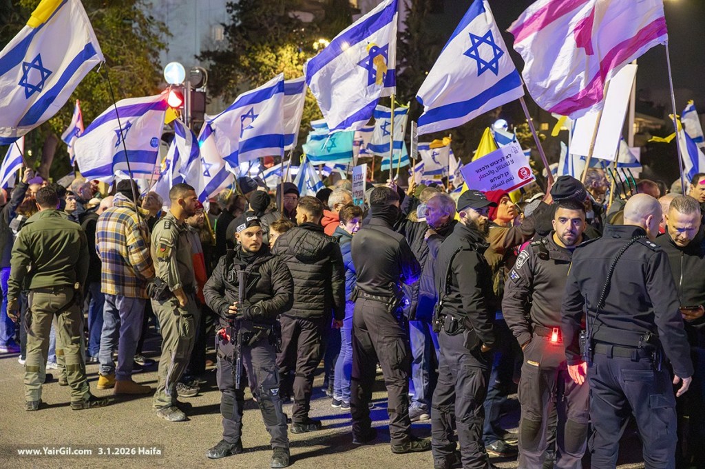 כמעט נתינים אבל עדיין אזרחים, בהפגנה השבועית בחיפה 3.1.2026 – וברקע פלישת ארה"ב לונצואלה וחטיפת ראש ממשלתם. ועוד ברקע, הפרעות של מתנגדי חסימת צומת חורב, עם שלטים בהתאם, אבל עם צעקות נגד השמאל. לכן הגיעו השבוע עשרות רבות של שוטרים שחצצו בין כ-100 נציגי ימין קיצוני לבין כ-2000 מפגינים חרדים לארצם.