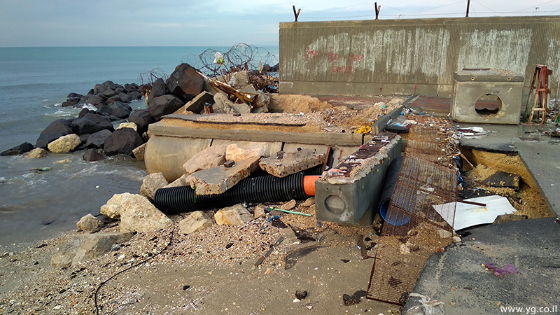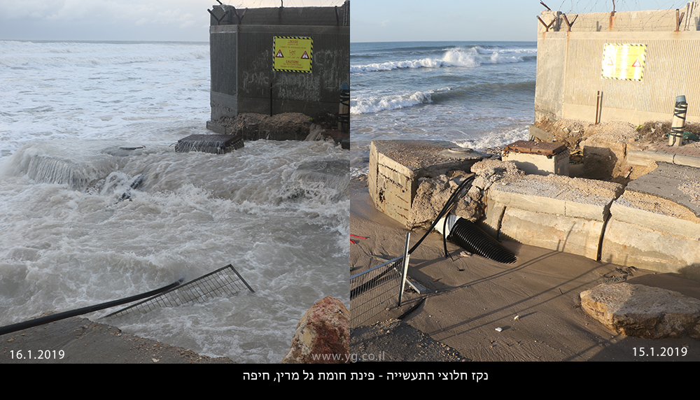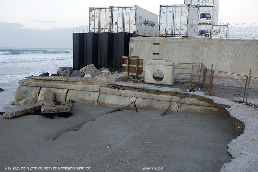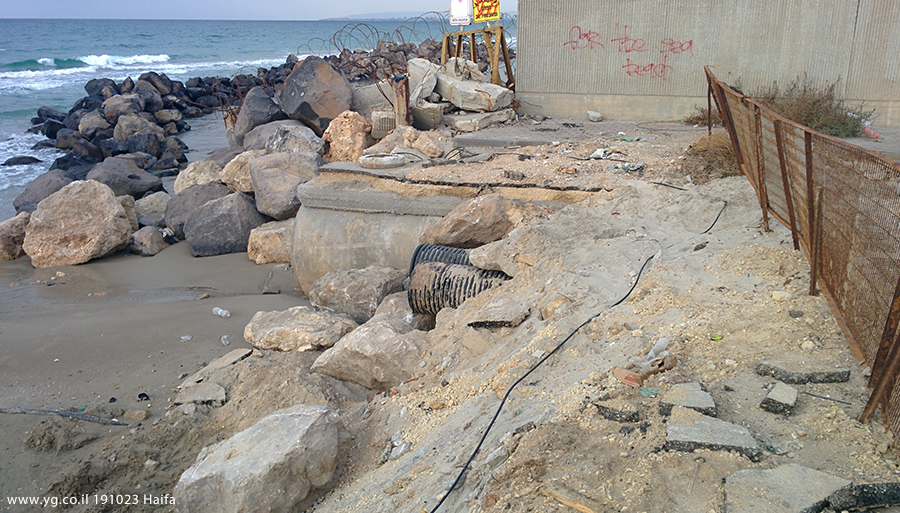 הים התיכון-פינת נקז חלוצי התעשייה וחומת גל מרין: מופע לפני התמוטטות קטע מהחומה; ינואר 2020 המפגע המשיך והתדרדר נקז חלוצי התעשייה, אוקטובר 2019; נעשו נסיונות לייצוב המקום, אך לשואהים התיכון-פינת נקז חלוצי התעשייה וחומת גל מרין: מופע חורפי ינואר 2020 המפגע ממשיך ומתדרדרנקז חלוצי התעשייה פינת חומת גל-מרין, חיפה 9.12.2021 הים התיכון נוגס בחוף http://www.YG.co.il