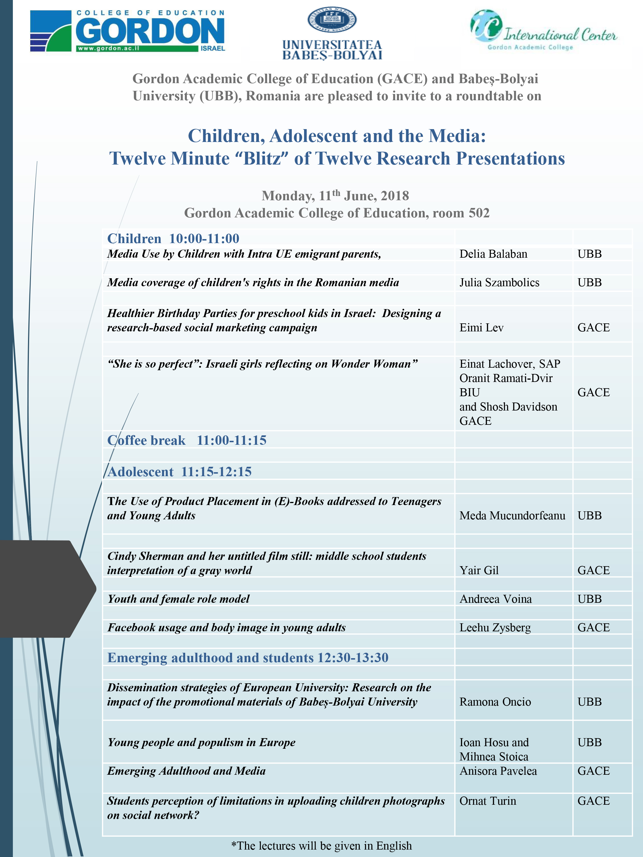 תכנית כנס בינלאומי בנושא ילדים ומתבגרים ומדיה שהתקיים במכללה האקדמית גורדון ב-2018. במהלך הכנס התקיימו 'פרזנטציות בזק' ובאחת מהן הצגתי תרגיל שקיימתי עם תלמידי חטיבת ביניים בנושא יצירתי במיוחד.
