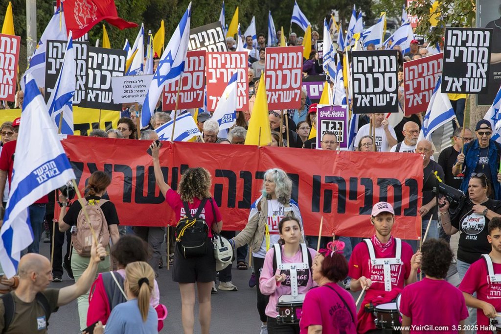 השבוע ה-83 למלחמת חרבות ברזל – ההפגנה השבועית בחיפה 3.5.2025 – צעדה ממרכז הכרמל לעצרת במרכז חורב