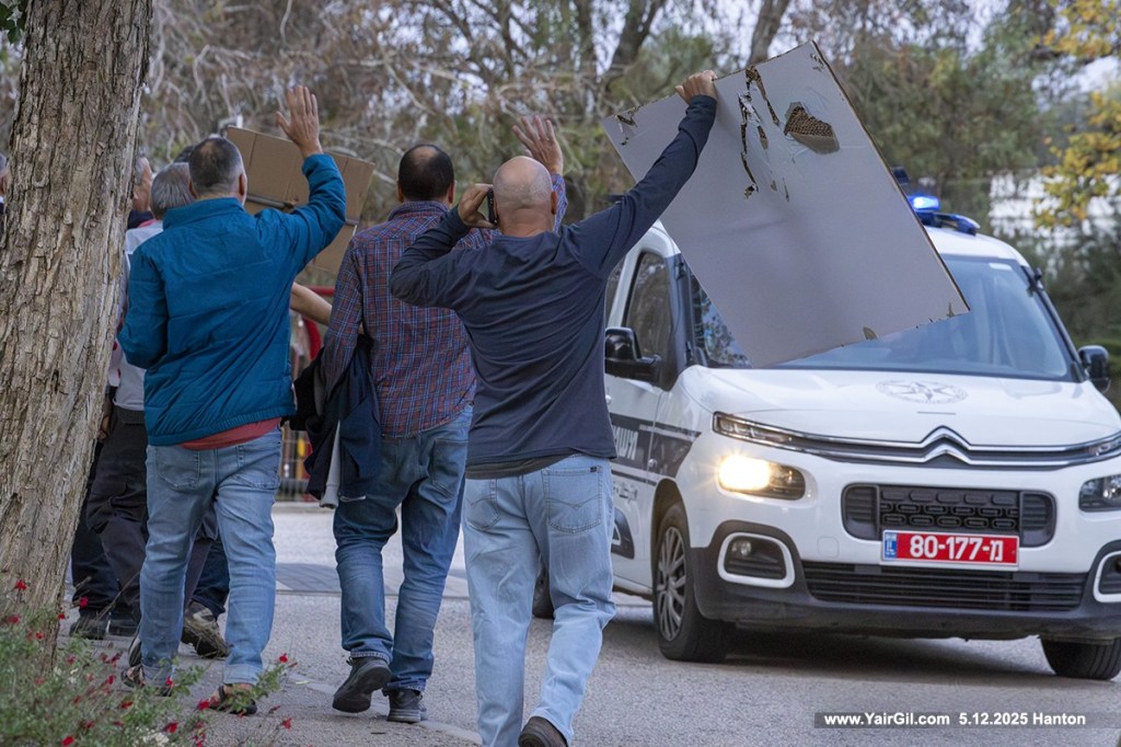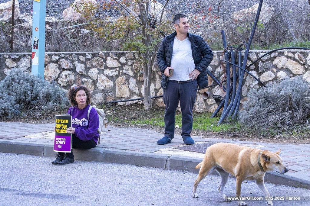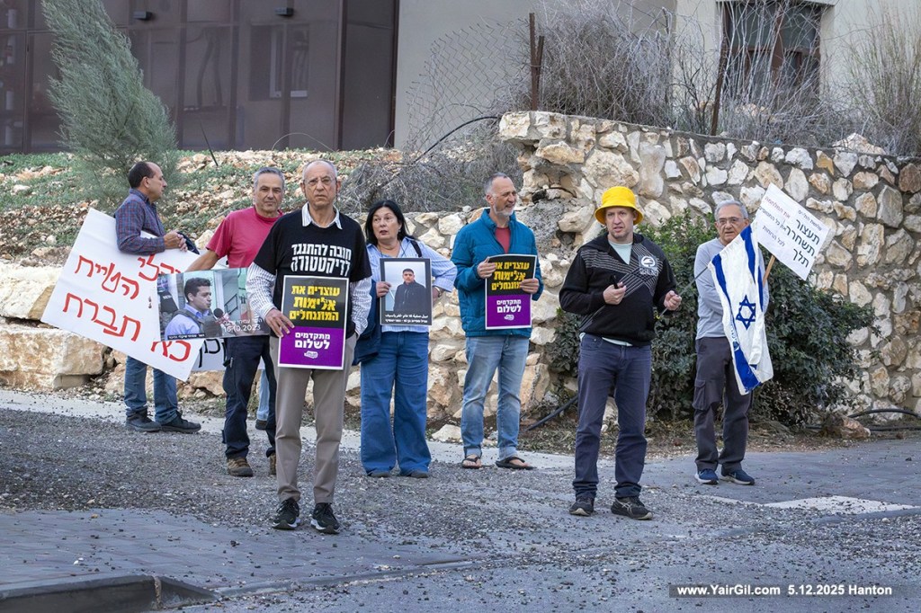 משמרת מחאה מול הבית של השר עמיחי שיקלי 5/12/2025 אחר הצהריים, קצת לפני שבת עם שלטים וצעידה שקטה בחוצות קיבוץ חנתון; שרו בשקט את "מי האיש החפץ חיים" (תהלים • פרק ל"ד • פסוק י"ג ); התפזרו בשקט כשהגיעה ניידת משטרה.