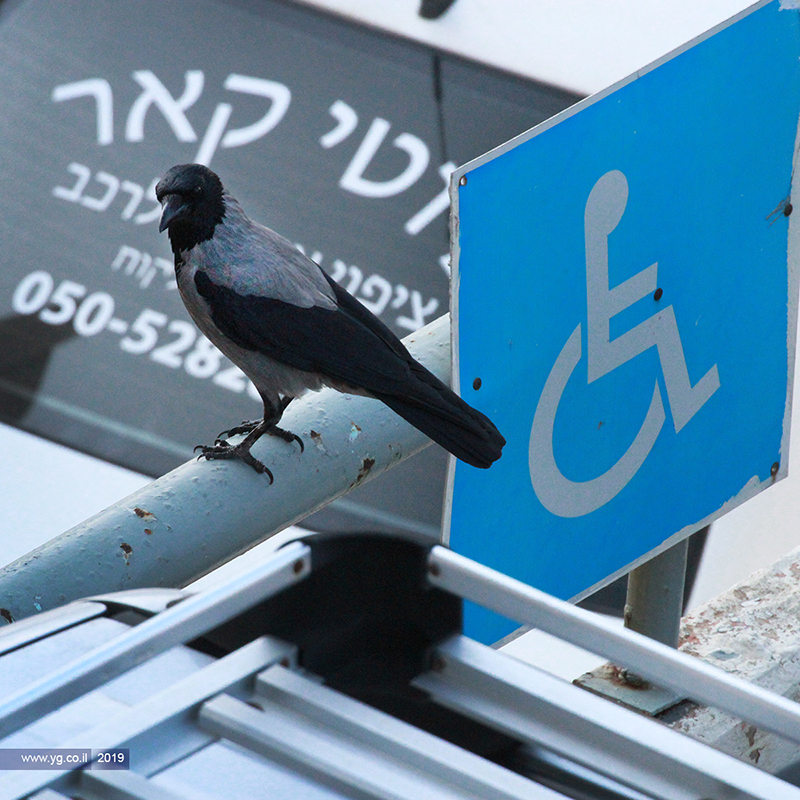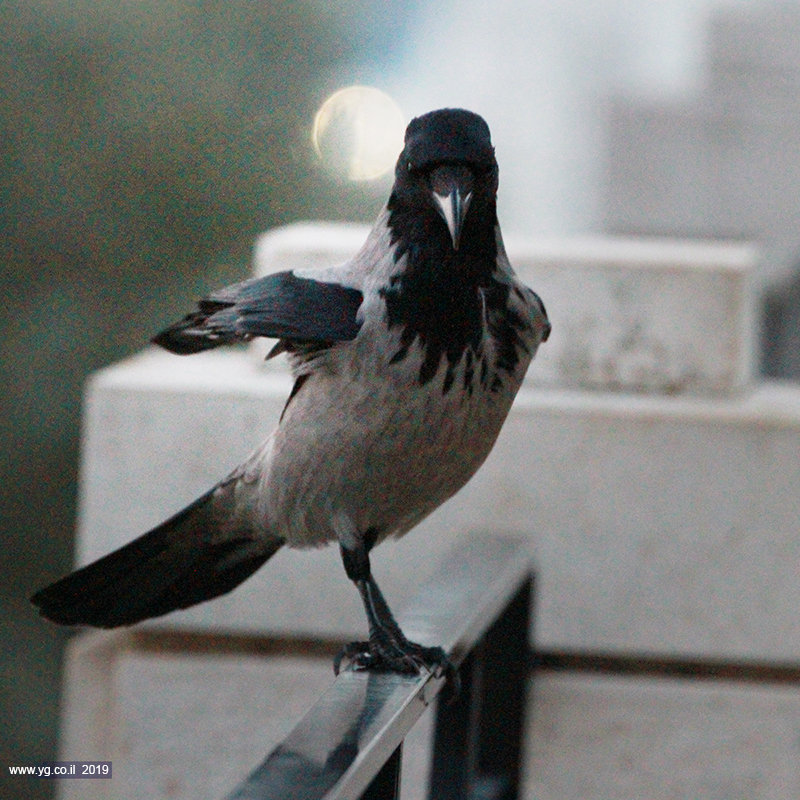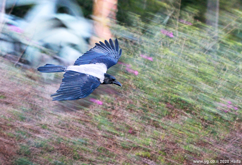 עורב אפור נוחת בגן הבהאי, חיפה 2020 – התמונה זכתה בפרס ראשון בתחרות צילום של מחוז חיפה, שהתקיימה תחת השם "עפים על הטבע העירוני" ב-2020.