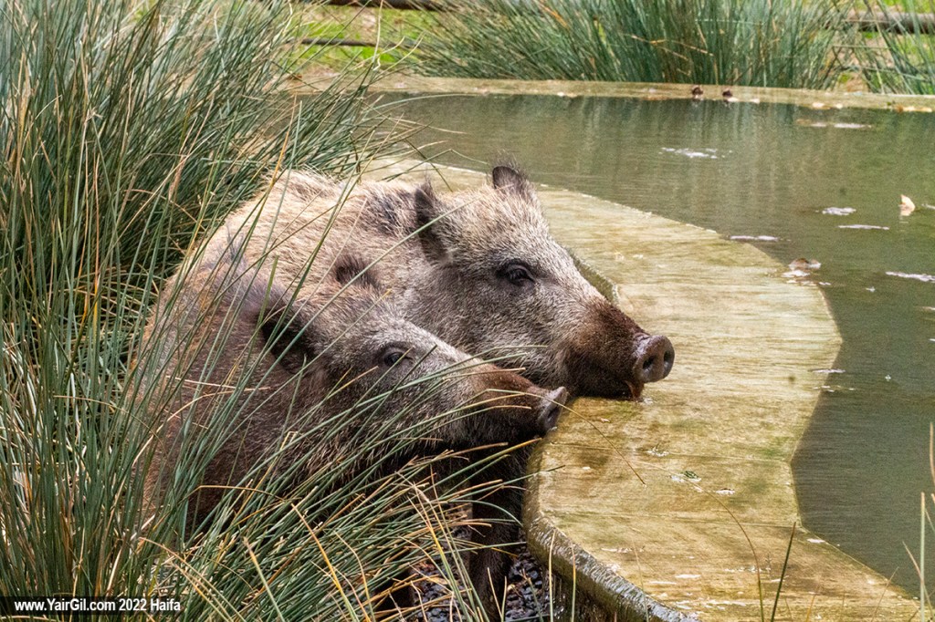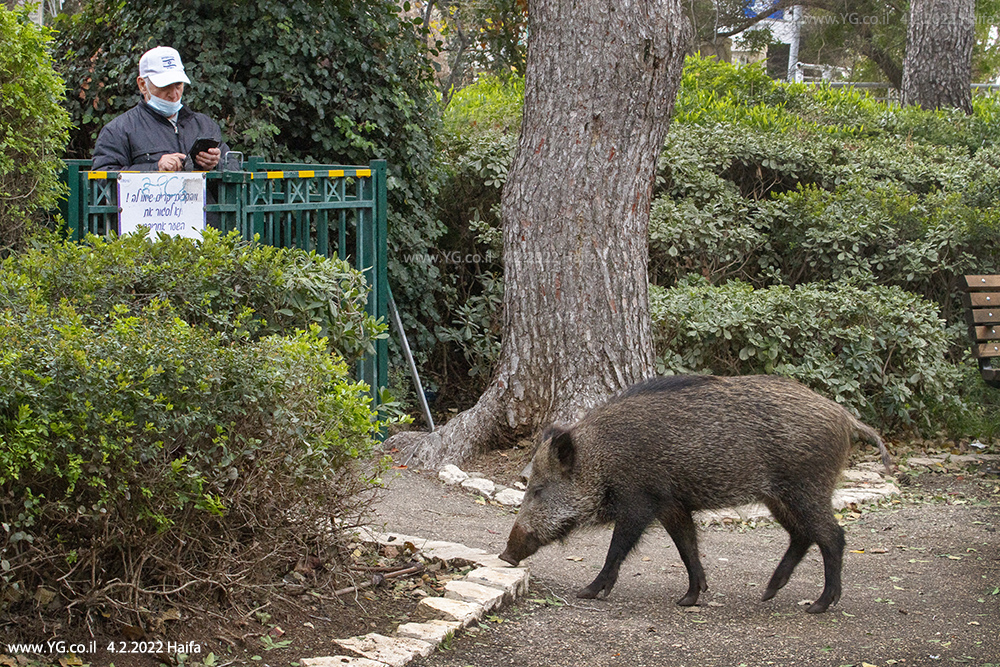 תושב חיפה מצלם חזיר בר בגן שמואל שעל רכס הכרמל. 4.2.2022. מכת חזירי הבר בחיפה מחלקת את תושבי העיר לשני מחנות: החוששים מפניהם ומנגד לאלה האוהבים אותם. העירייה מנסה להתמודד עם התופעה ללא הצלחה שאפשר לראות באופן ברור.שני חזירי בר ליד בריכת דגי הנוי בגן שמואל בחיפה 2022 – שמחתי להשתתף בתערוכת טבע מקומי 6, שהוצגה ב-2023 במוזיאון ארץ ישראל בתל אביב, עם צילום אחד בקטגוריית טבע עירוני, ובו שני חזברי"ם חיפאים למהדרין. תודה לעיריית חיפה שאיפשרה את 'מופעי חיות הפרא' בעיר בנדיבות ולאורך זמן. התערוכה תסגר במוצ"ש 30.12.2023.