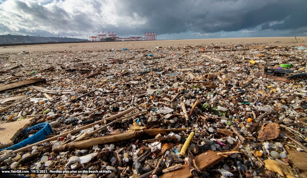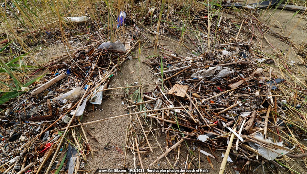 פלסטיקים אחרים וליכלוכים אחרים + פסולת אורגנית על החוף בחיפה 19.2.2021 אחרי הסערה