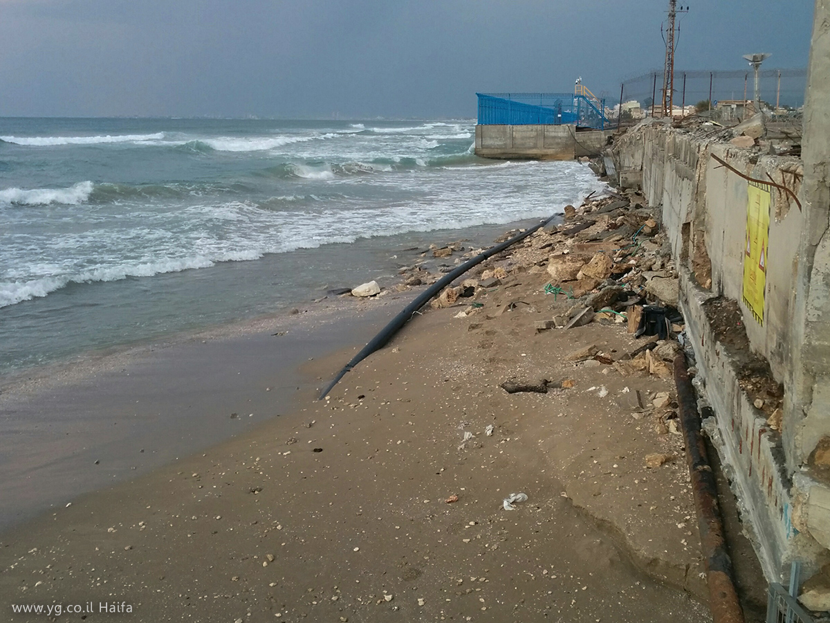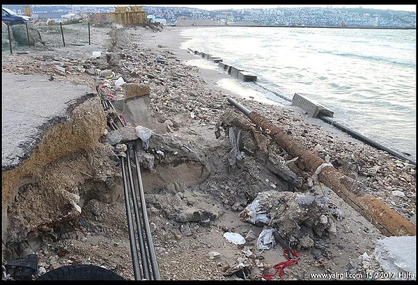 הים נגס בתשתיות שלאורך חוף חלוצי התעשייה בחיפה. צנרת דלקים שבשימוש ושאינה בשימוש גלוייה לעין כל עקב סחיפת החול. הצינורות הדקים שימשו ככבלי תקשורת אופטים , של בזק. התמונה פורסמה ב'הארץ') 19.2.2017 ובעתון חרדי.