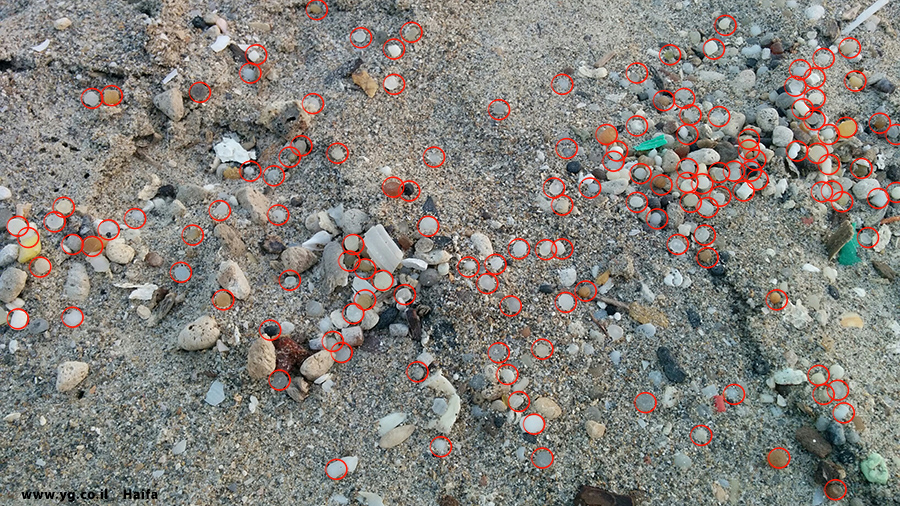 פלסטיקים קטנים. קטנטנים, פחות מחצי סנטימטר אורכם. על חוף הים. העיגולים האדומים (ראו להלן) מסמנים את 139 פתיתי הפלסטיק שבתמונה מטה.