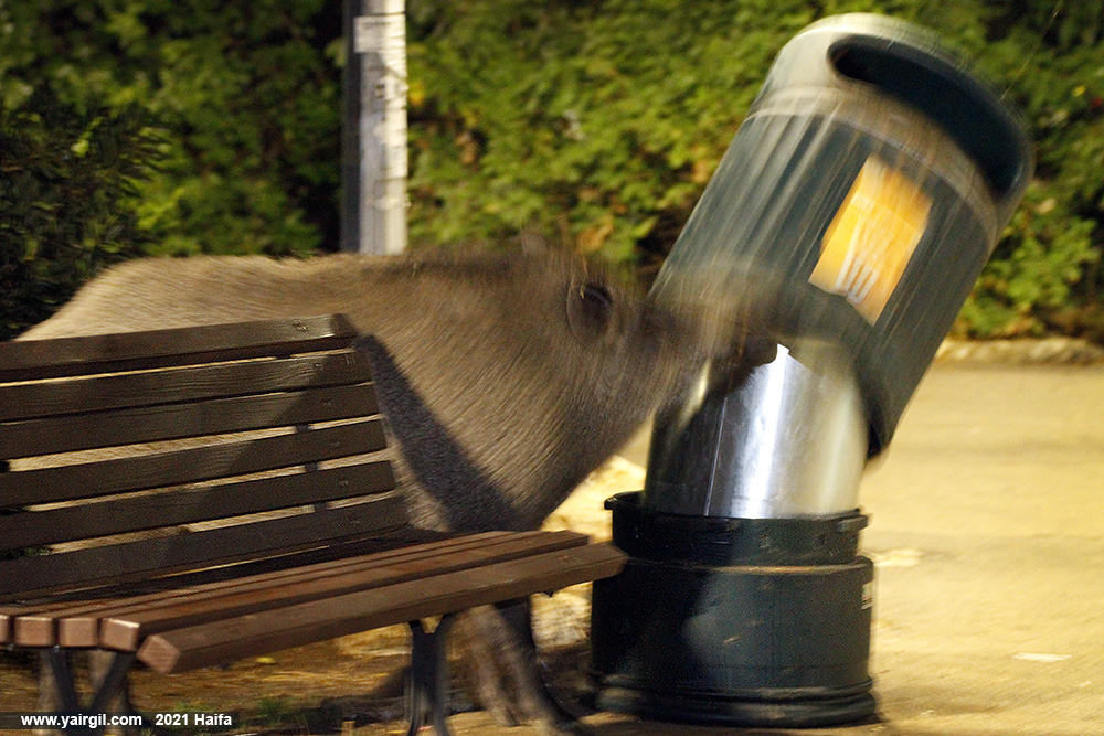 עוד טשטוש תנועה: הספסל היציב חד, תנועת ראש החזיר מלמטה כלפי מעלה, מטושטשת כמו החלק העליון של פח האשפה שהוא מעיף: הרקע מטושטש מפני שהחדות לא במישור הרקע.